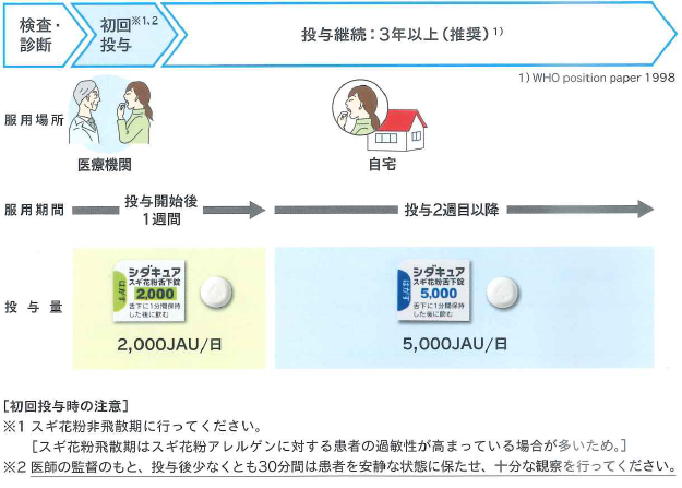 スギ花粉症であることが確認できたら、スギ花粉エキス舌下錠であるシダキュアを、最初の1週間は2000JAU錠を、2週目以降は5000JAU錠を1日1回1錠服用します。