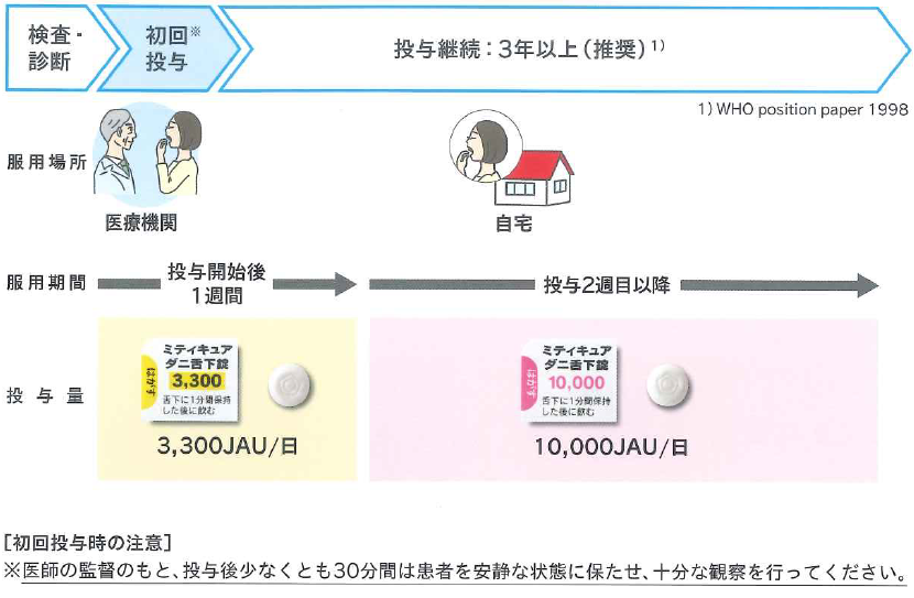 ダニアレルギー性鼻炎であることが確認できたら、ダニ抽出エキス舌下錠であるミティキュアを、最初の1週間は3300JAU錠を、2週目以降は10000JAU錠を1日1回1錠服用します。